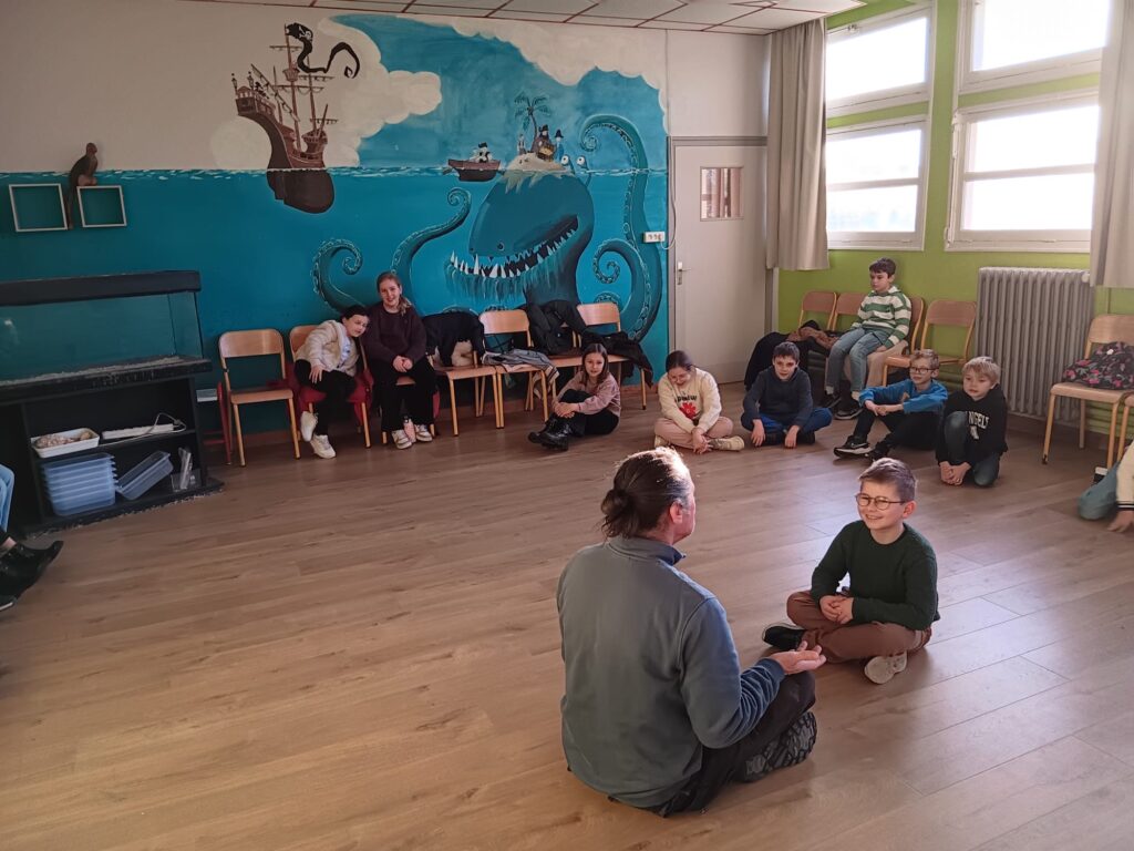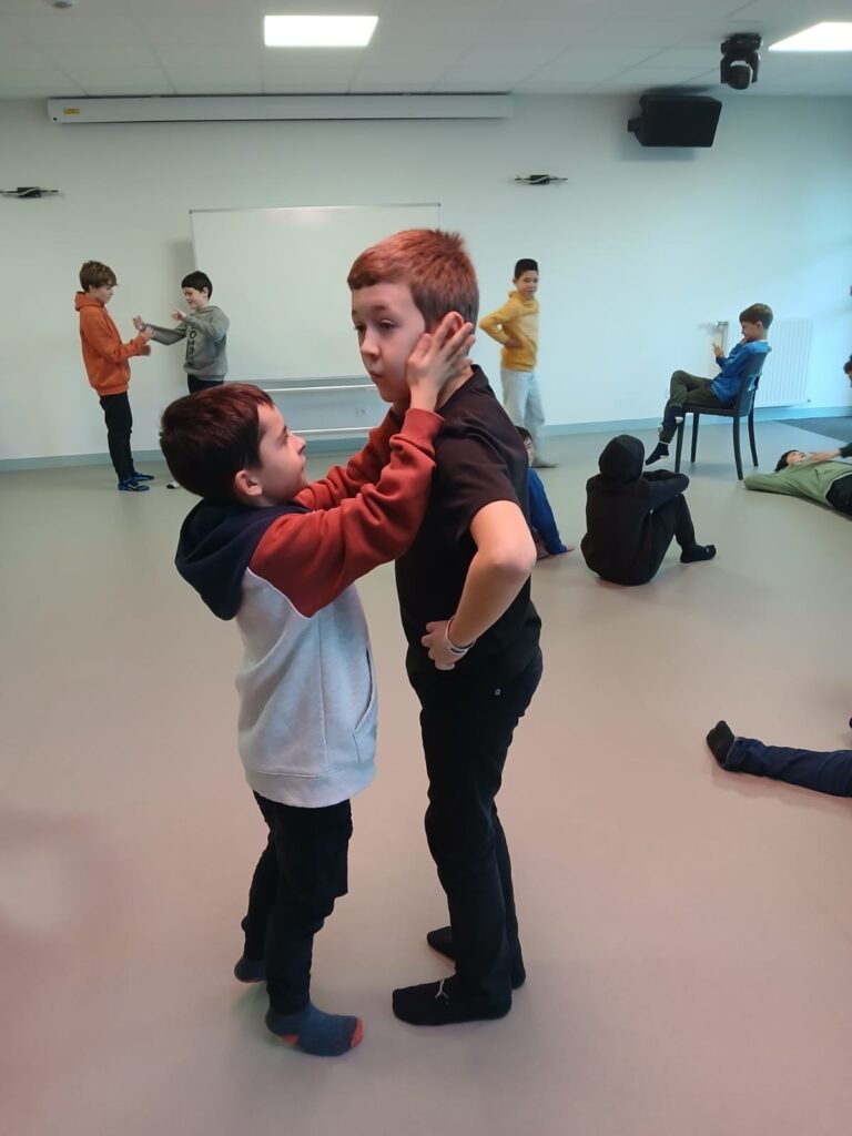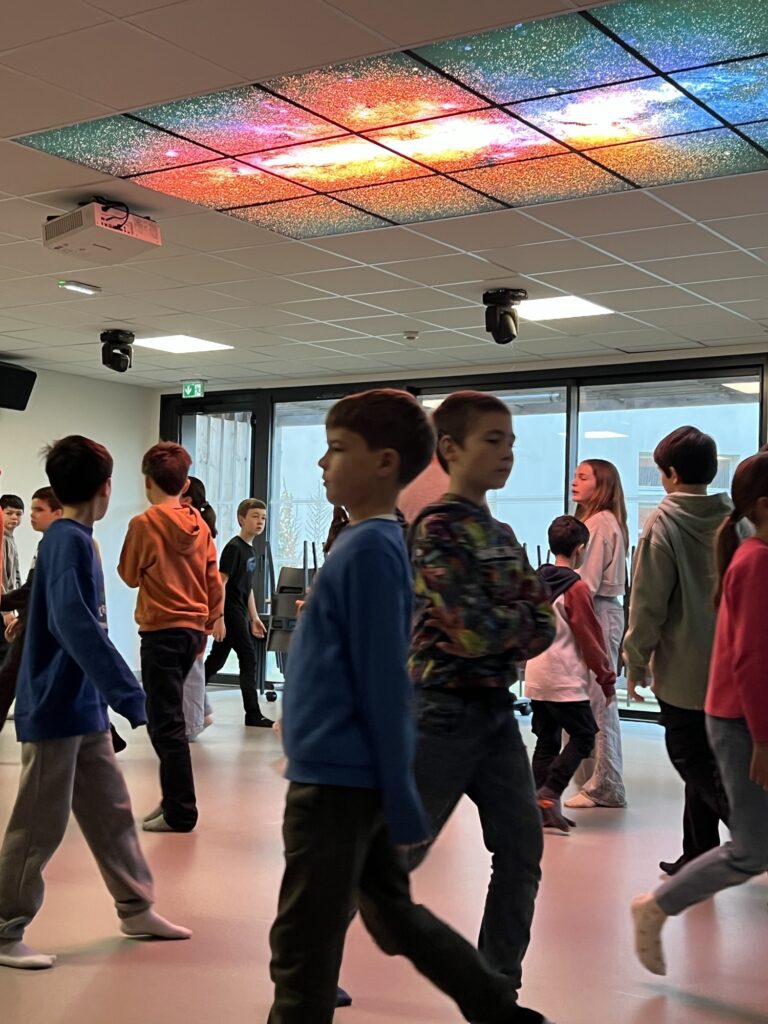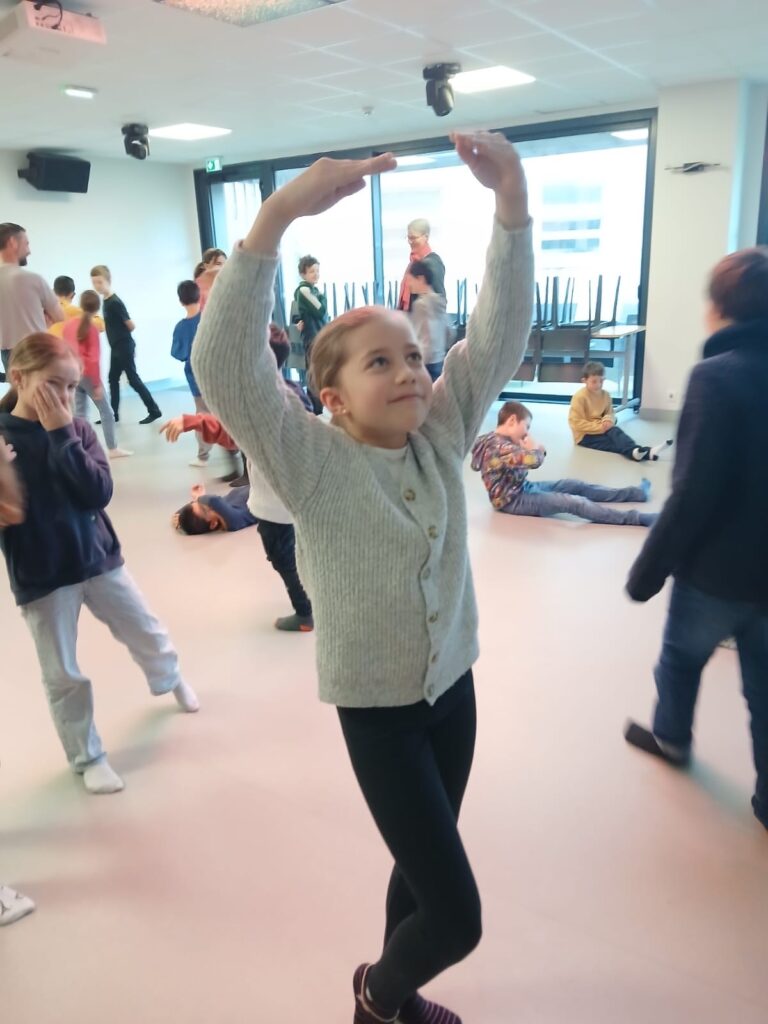 Ce matin, les enfants regroupés par classe, suivent des ateliers de théâtralité. Ils travaillent la concentration, l’écoute, le mime, les vire-langue mais prennent aussi des leçons d’anatomie : la colonne vertébrale, la respiration, la posture, le fonctionnement de la peau, des muscles…